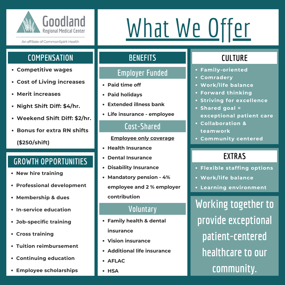 Goodland Regional Medical Center is an Equal Opportunity employer committed to a diverse and inclusive workforce. All qualified applicants will be considered for employment without regard to race, color, religion, sex, sexual orientation, gender identity, national origin, age, disability, marital status, parental status, ancestry, veteran status, genetic information, or any other characteristic protected by law.