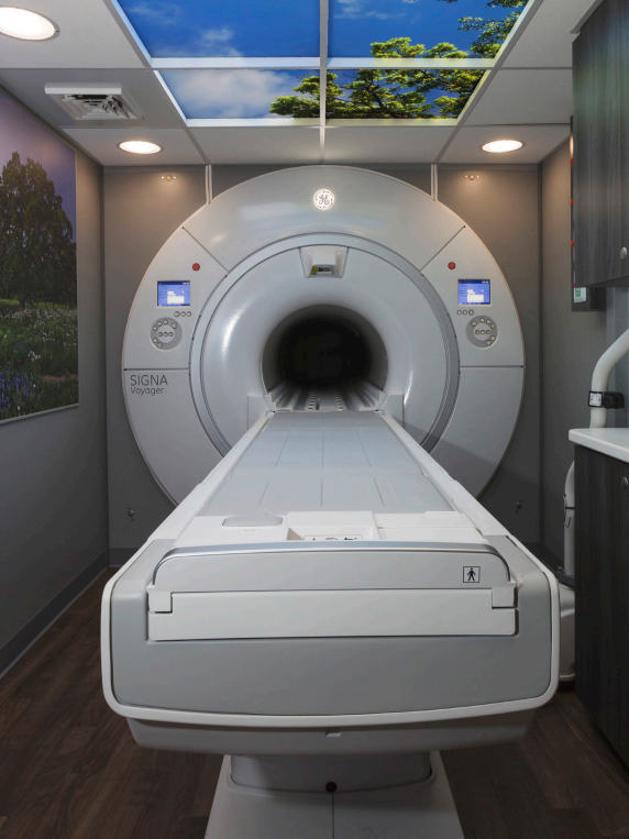 Our mobile MRI equipment, GE Healthcare’s SIGNA Voyager, is designed to help maximize comfort for patients while delivering uncompromised image quality. It has a wide bore, many comfort features, and handles patients up to 550 lbs.